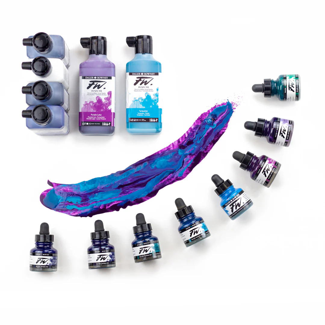 Daler Rowney Pearlescent inks are lightfast acrylic inks with an amazing shimmer. This breakthrough in colour technology offers limitless creative potential in areas not normally associated with inks and includes applications to wood, leather, glass,ceramics, paper, board & canvas. All colours are intermixable. They are permanent and translucent, but work best if put down freely rather than applying successive layers of colours. Pearlescent Inks pigments are large in particle size so will not go through fine line nozzles for airbrushes, nor will they be suitable for technical pens or fountain pens. The best means of applying pearlescent colours is by using a dipper pen, ruling pen or brush.