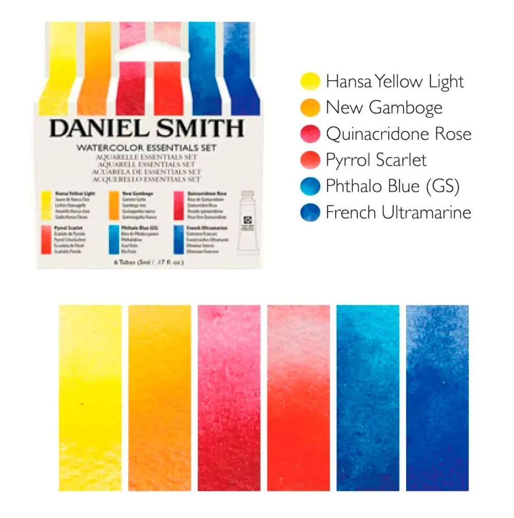 A small sample set from DANIEL SMITH watercolours offers the Essential Mix of just what you need as a starter kit. The set has six 5ml transparent watercolours. The pigments have been carefully selected to give you a wide range of colours & values. When mixed together the colours you can create are endless.