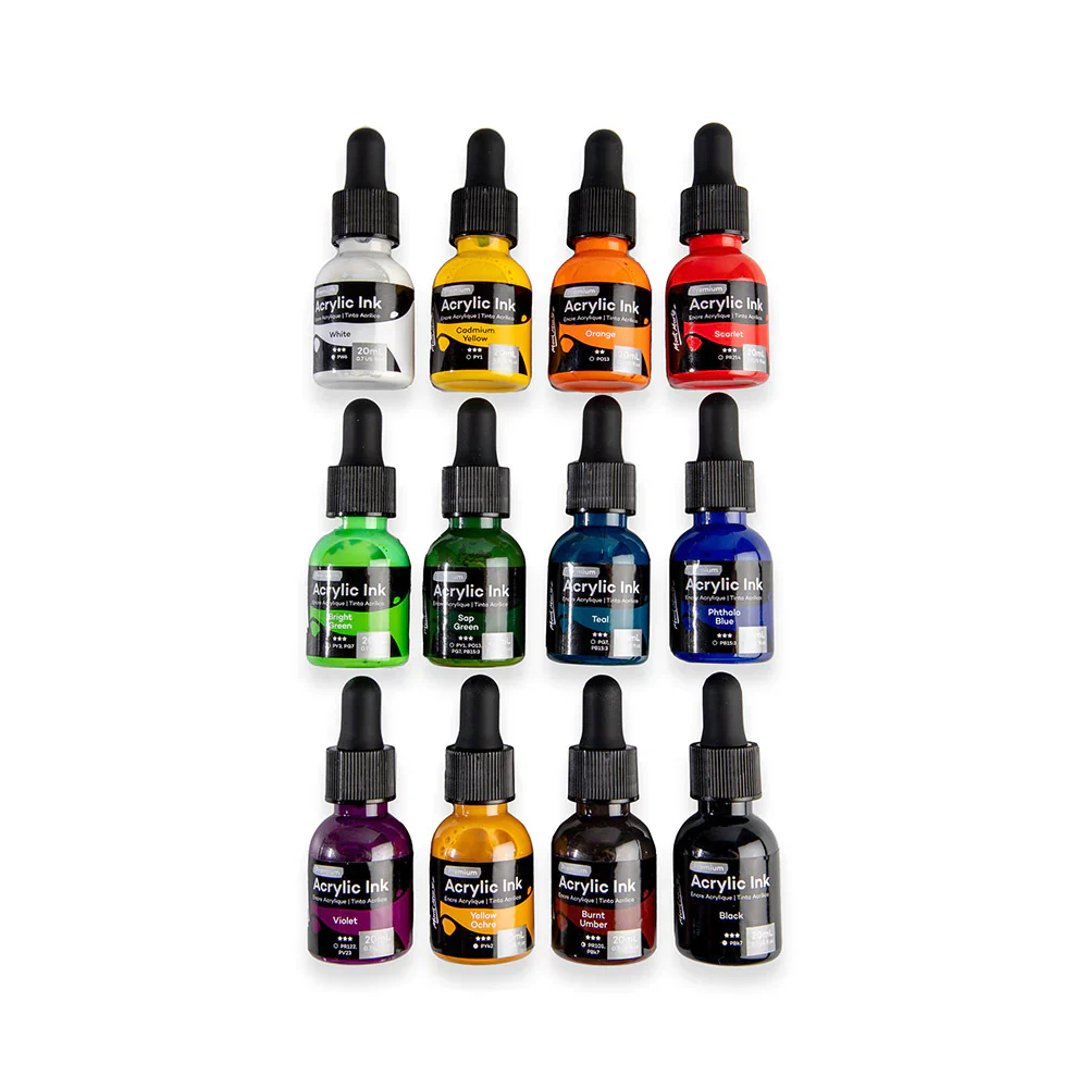 - 12pc vibrant acrylic Inks: White, Cadmium Yellow, Orange, Scarlet, Bright Green, Sap Green, Teal, Phthalo Blue, Violet, Yellow Ochre, Burnt Umber, Black